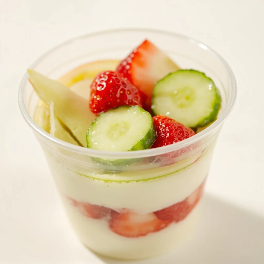 This simple yogurt cup combines the creamy texture of yogurt with the vibrant flavors of fresh cucumber, apple, and strawberry juice. Topped with tender strawberry pieces, it makes for a light and colorful treat that is as pleasing to the eye as it is to the palate.