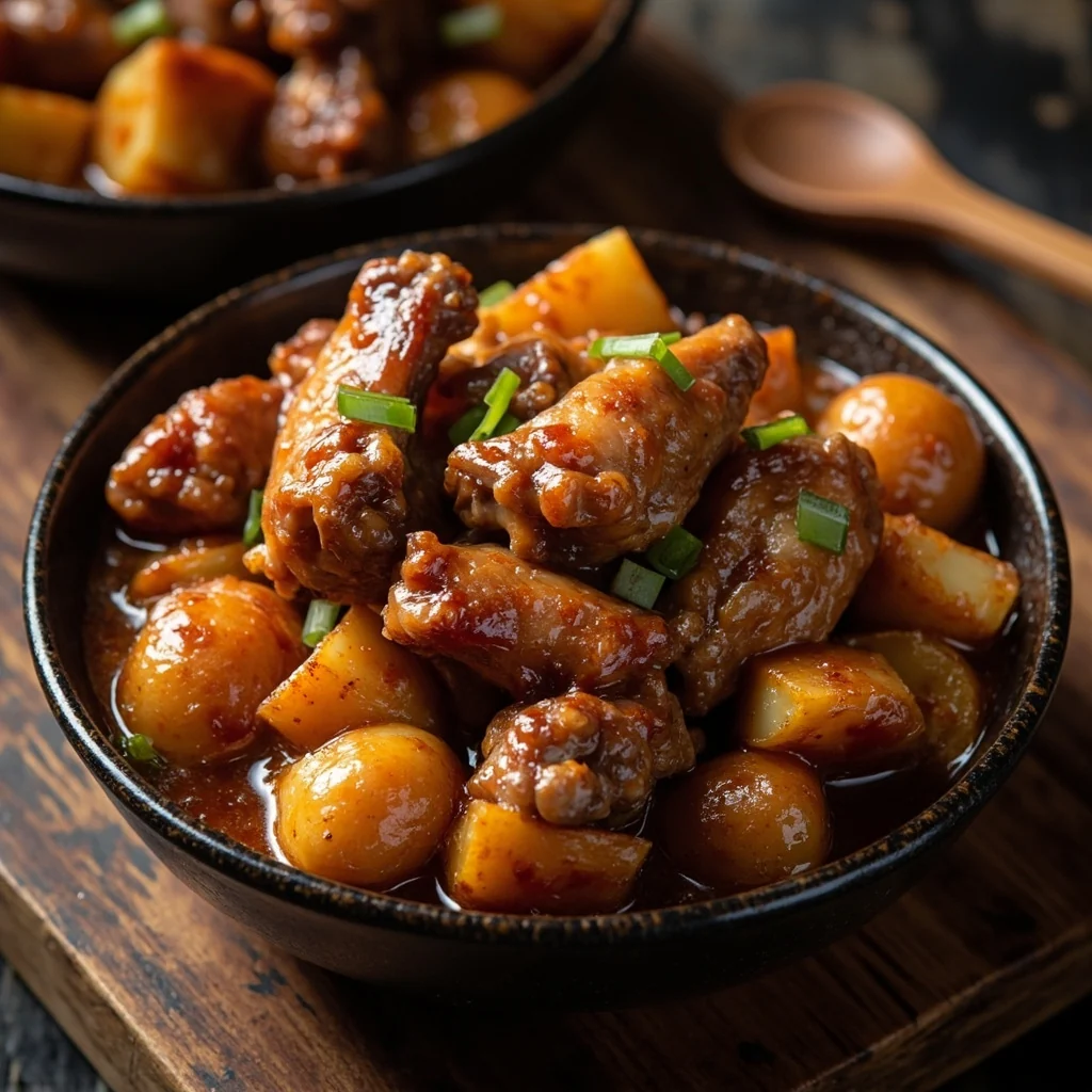 Une fois que la sauce a réduit à un enrobage épais et brillant et que les ailes de canard sont tendres lorsqu'on les perce, retirer du feu. Garnir d'oignons verts hachés. Servir chaud sur du riz vapeur, en versant extra de sauce sur le dessus.