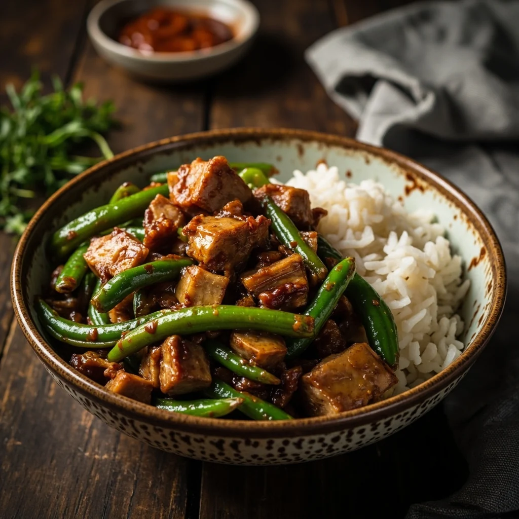 Ce classique chinois réunit deux étoiles texturales : les haricots verts croquants-tendres et le poitrine de porc riche qui fond en bouche. La clé est d'obtenir cette dorure profonde sur le porc avant d'ajouter le liquide de braisage - c'est là que réside toute la saveur.