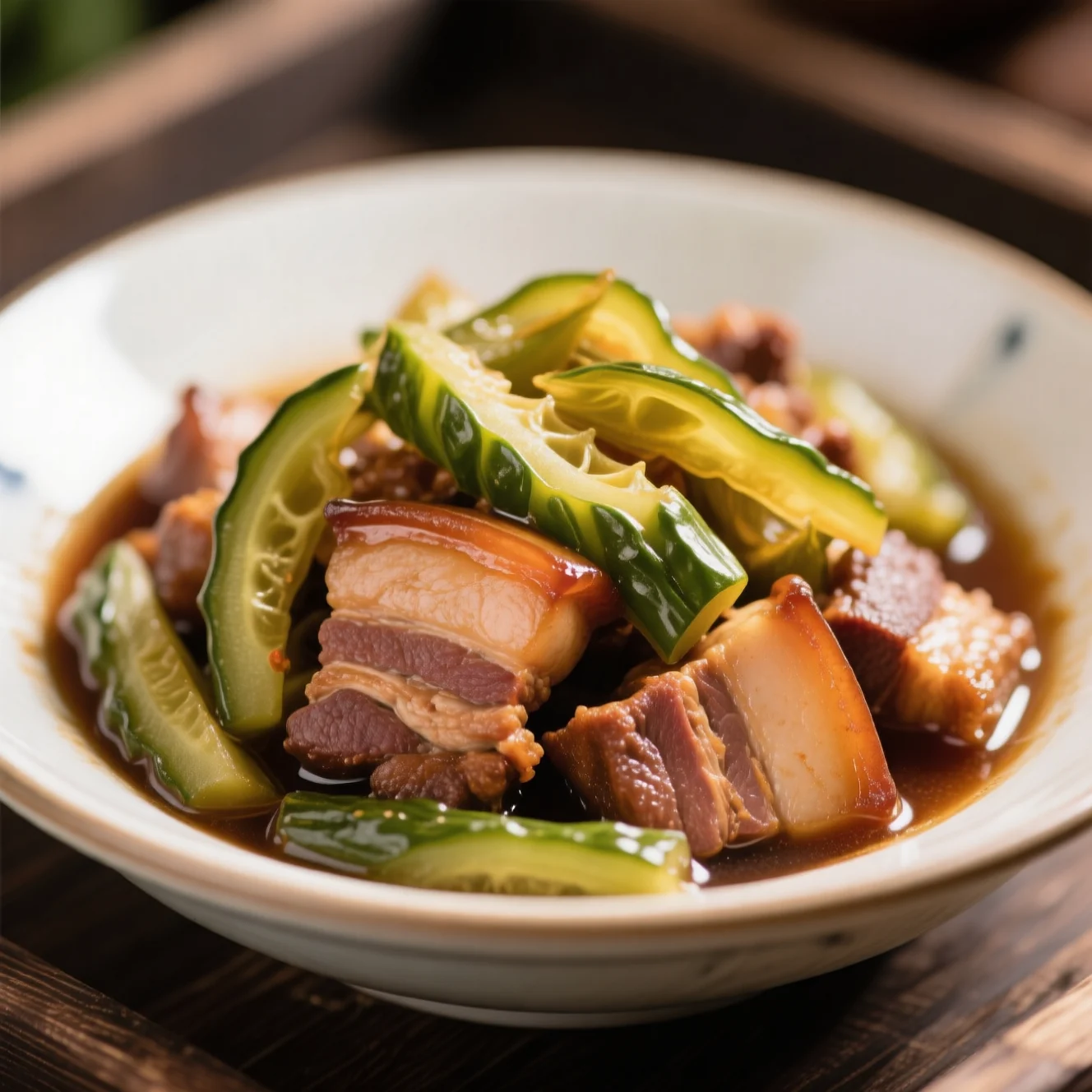 Ce plat utilise les peaux de concombre salées, un ingrédient traditionnellement conservé souvent rapporté des villes natales en Chine. Après un long trempage pour éliminer l'excès de sel, les peaux sont braisées avec le porc jusqu'à tendreté, créant un équilibre unique de textures et de saveurs.