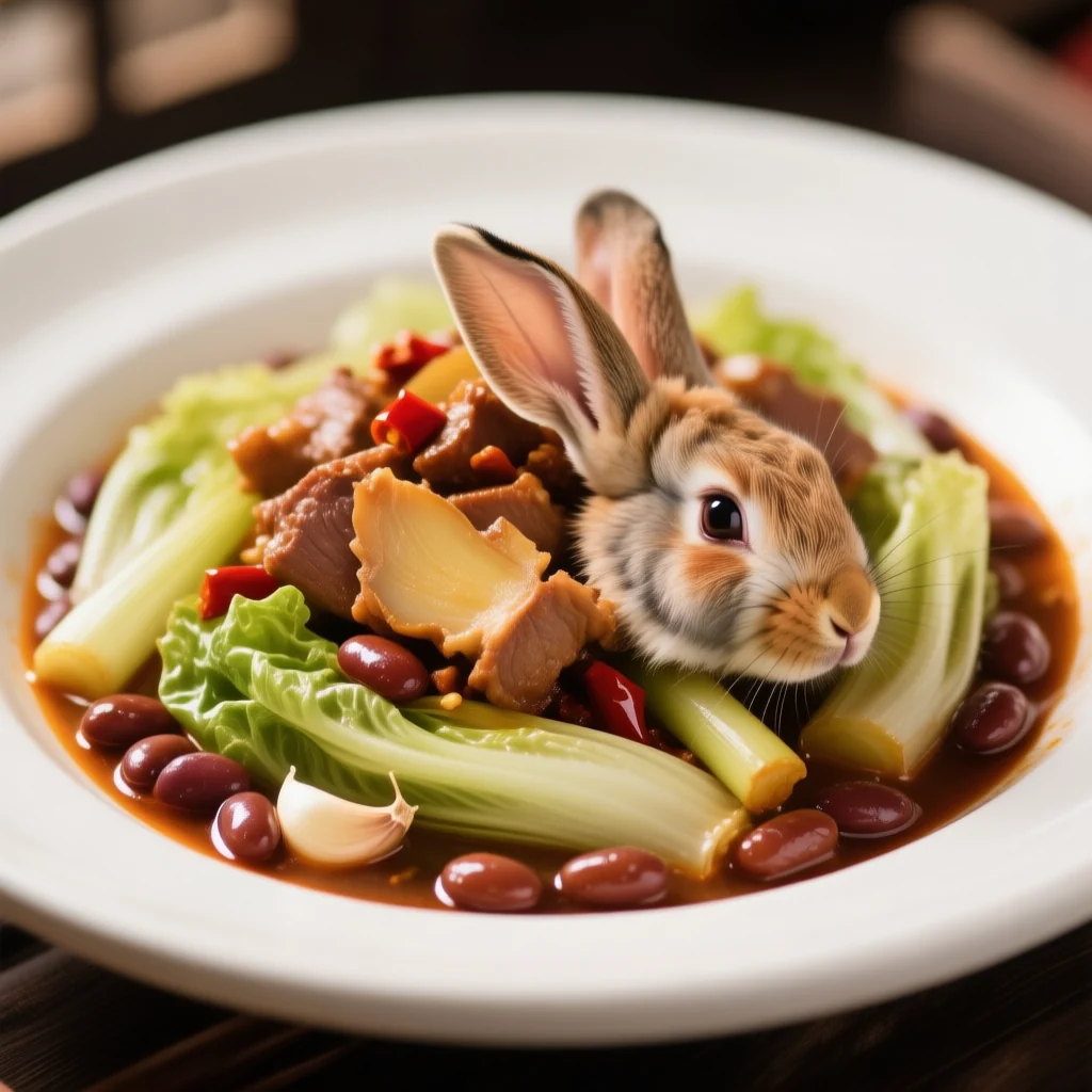 Ajoutez les tiges de laitue, la sauce soja et 1/2 tasse d'eau. Couvrez et laissez mijoter 12-15 minutes jusqu'à ce que le lapin soit cuit et que la laitue soit tendre. Ajustez le sel selon votre goût.