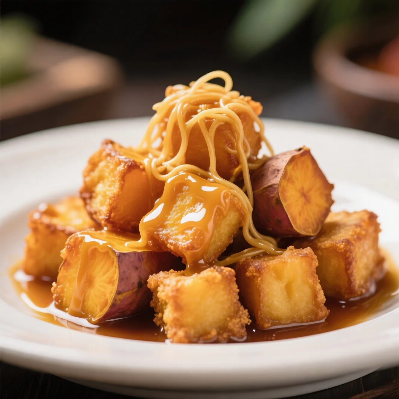 Des cubes de patate douce frits et croustillants recouverts d'un caramel doré qui s'étire en fils délicats—un dessert chinois emblématique aussi amusant à manger qu délicieux. La clé est de timing le caramel juste pour qu'il enrobe chaque pièce sans devenir collant.