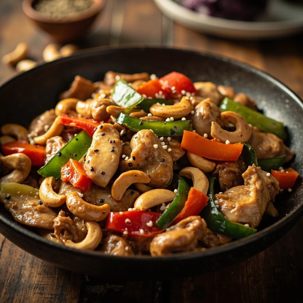 Un sauté rapide et savoureux de style chinois, avec des morceaux de poulet tendres, des noix de cajou croquantes et des légumes colorés assaisonnés de poivre blanc aromatique.
