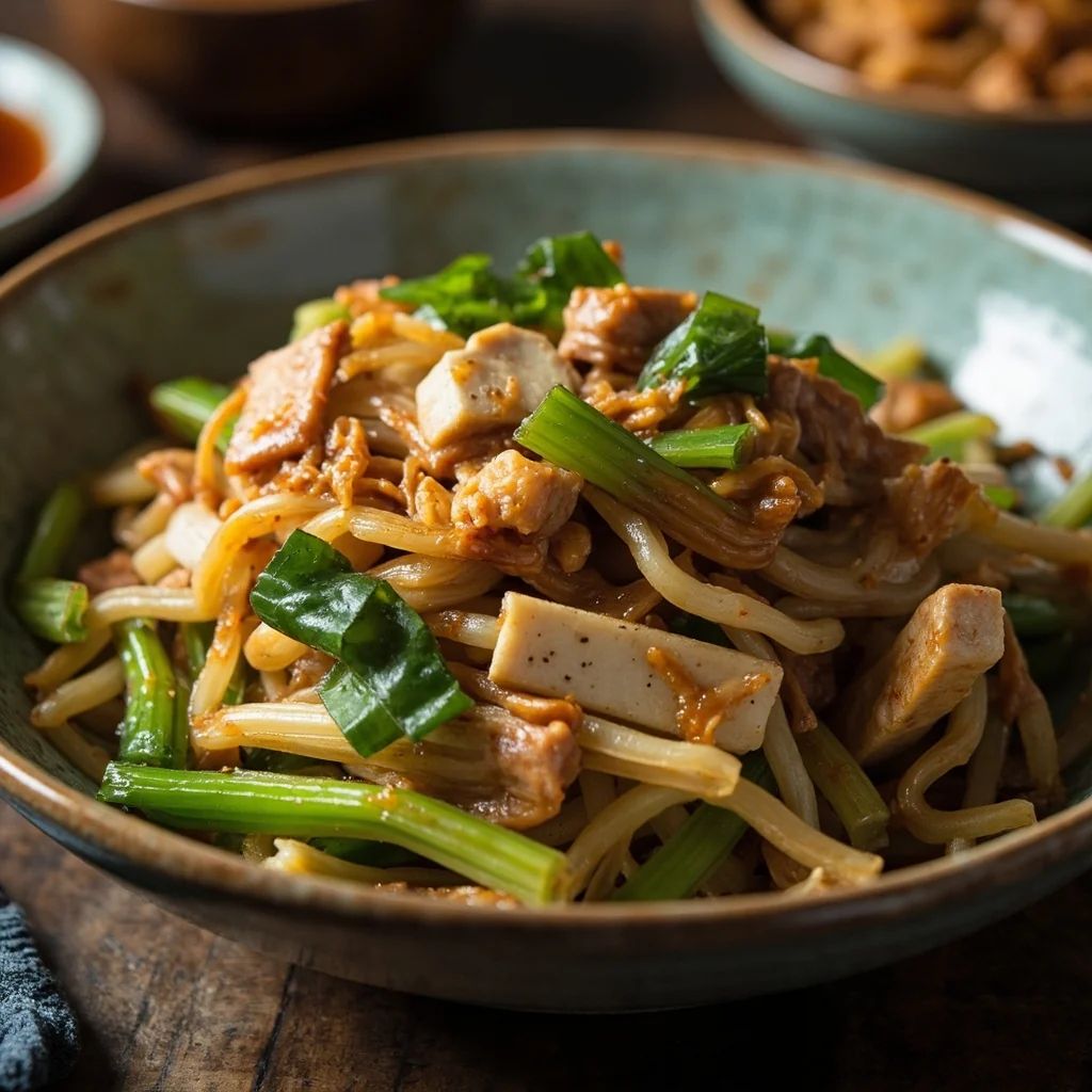 Un stir-fry chinois rapide et savoureux qui associe le céleri croquant au tofu pressé soyeux et aux lanières de porc tendres. Ce plat familial offre un excellent contraste de textures et se prépare en moins de 30 minutes.