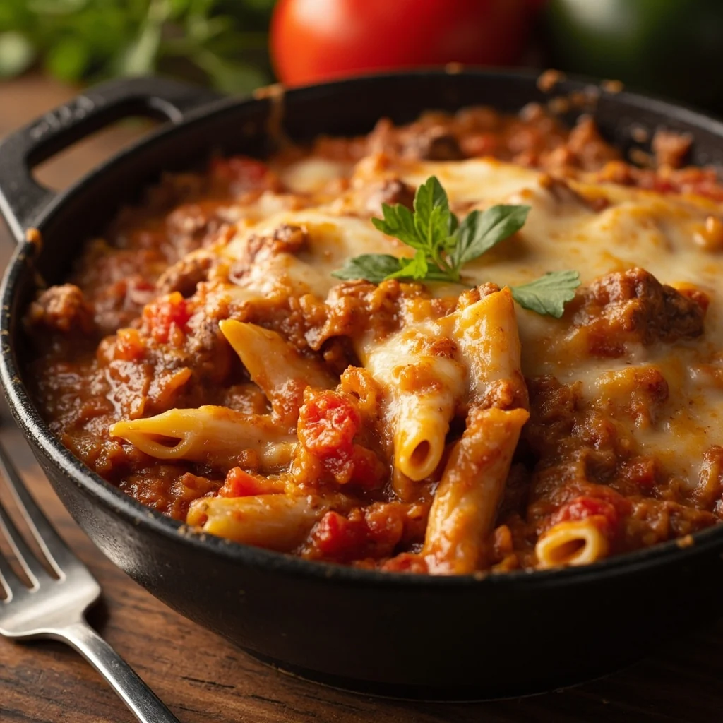 Ajouter les pâtes cuites au mélange de bœuf et de tomates. Remuer le tout jusqu'à ce que le mélange soit homogène. Transférer dans un plat à gratin de 23x33 cm graissé et étaler uniformément.