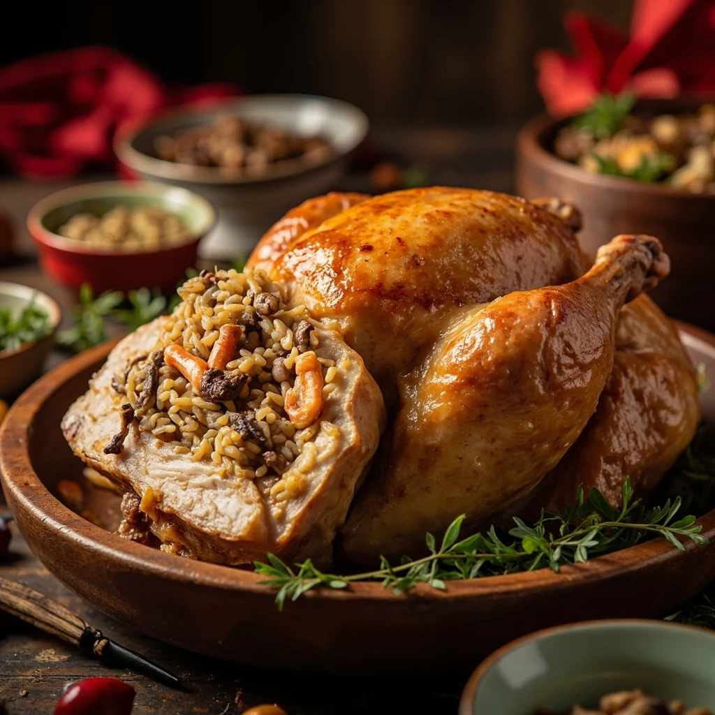 Transférer le riz vapeur dans un grand bol. Ajouter le mélange du wok, les oignons verts, 2 cuillères à soupe de vin de cuisine, le sel et le poivre. Mélanger le tout jusqu'à ce que ce soit bien combiné. Verser carefully la farce dans la cavité de la dinde, en la remplissant légèrement. Attacher les pattes ensemble avec de la ficelle de cuisine et rentrer les ailes sous le corps.