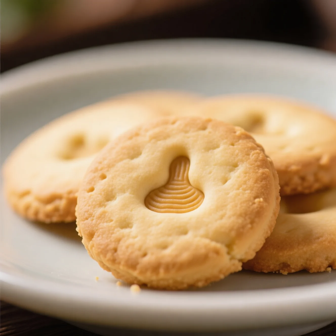 Biscuits chinois traditionnels croustillants qui fondent dans la bouche, avec une dépression distinctive en forme d'empreinte de pouce au centre. Ces pâtisseries dorées ont une texture délicate beurrée et une douceur subtile qui les rend irrésistibles.