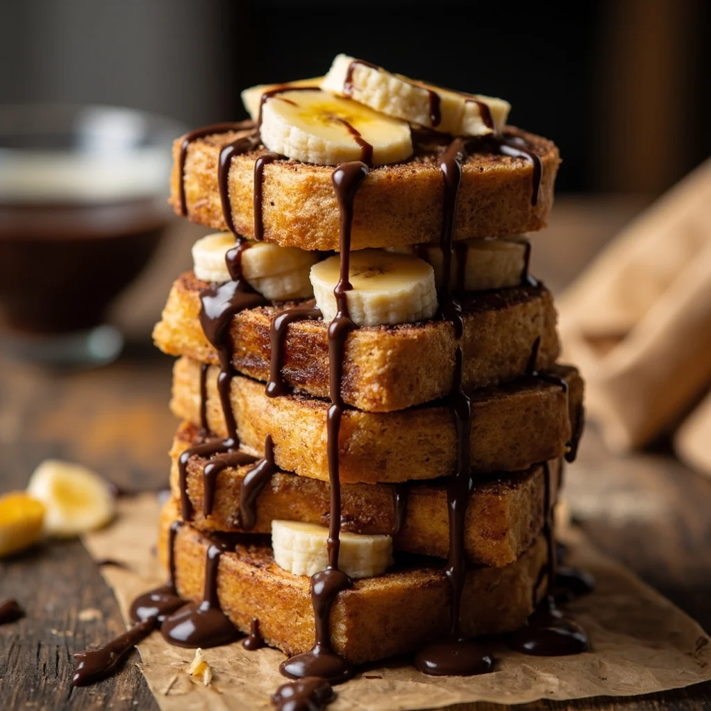 Disposer les cubes de pain perdu chauds dans des bols ou des assiettes. Ajouter une couche généreuse de tranches de banane fraîche entre les cubes de pain, puis parsemer de pépites de chocolat. La chaleur du pain fera fondre légèrement le chocolat.