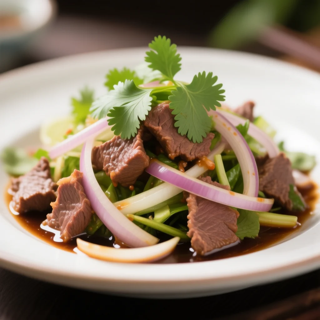 Placez le bœuf tranché dans un grand bol à mélanger. Ajoutez l'oignon, la coriandre et les piments dessus.