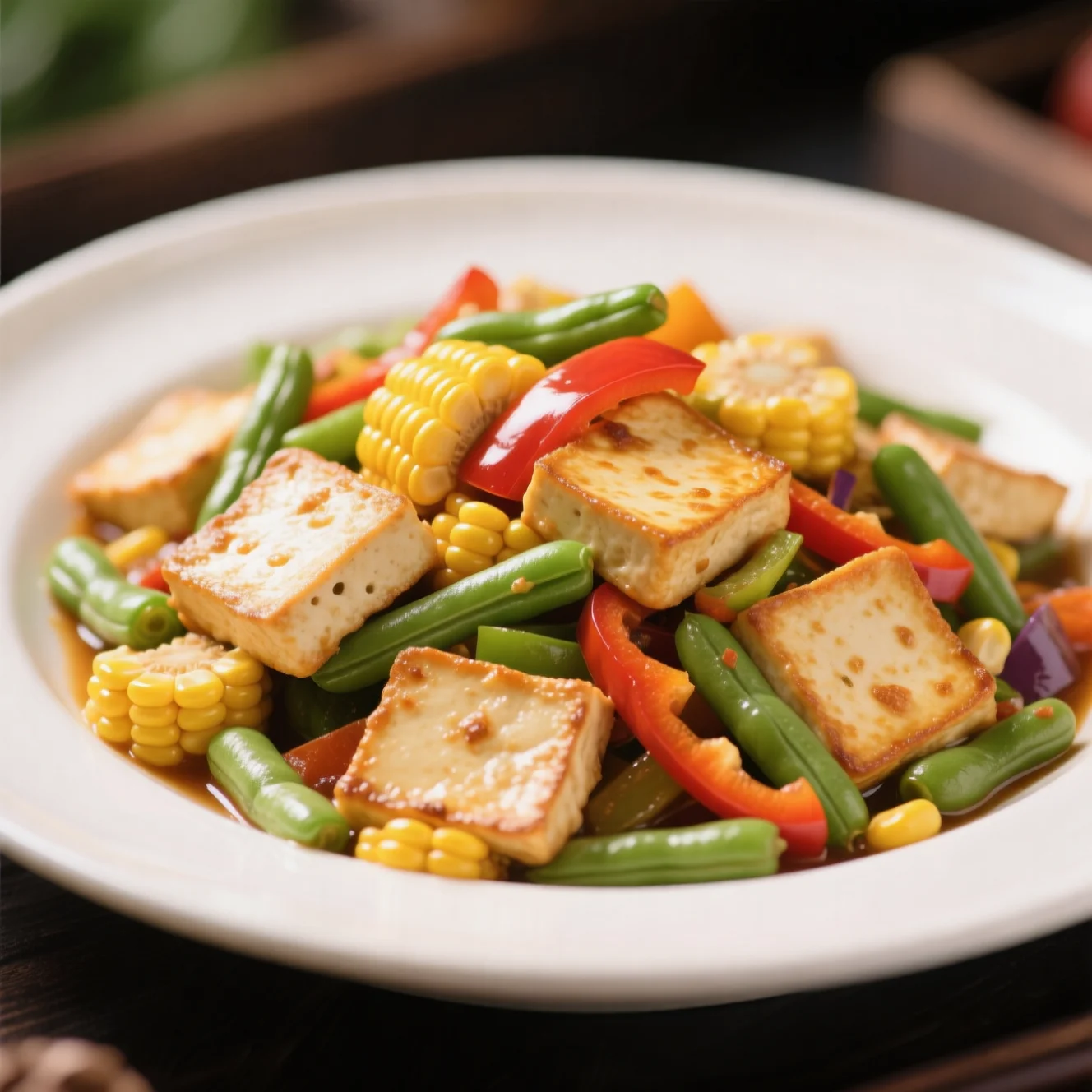 Coupez le bloc de tofu ferme en tranches épaisses. Chauffez une poêle à fond plat à feu moyen avec un filet d'huile. Faites frire les tranches de tofu jusqu'à ce qu'elles soient dorées et croustillantes des deux côtés, puis retirez-les de la poêle et réservez.