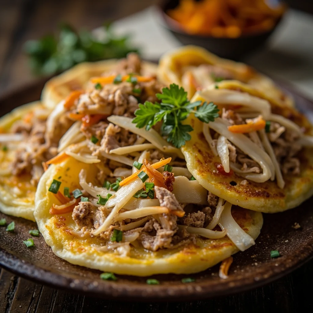 Diviser la pâte en 8 boules égales. Aplatir chaque boule en disque, ajouter une généreuse cuillerée de farce au centre, puis replier les bords et sceller. Aplatir doucement en forme de patty. Chauffer l'huile restante dans la poêle à feu moyen-doux. Cuire chaque crêpe 3-4 minutes de chaque côté jusqu'à ce qu'elle soit dorée et cuite. Servir chaud.