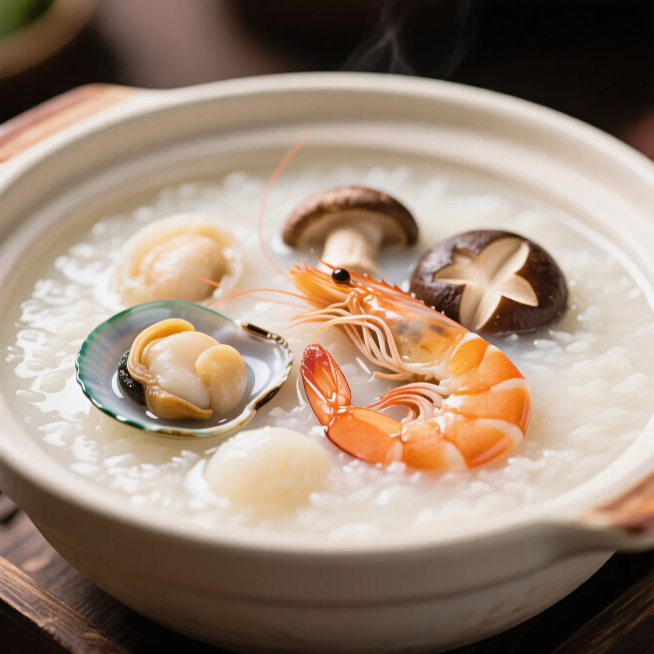 Un porridge de riz réconfortant et soyeux garni de crevettes, de pétoncles et de champignons, mijoté lentement pour une texture riche.