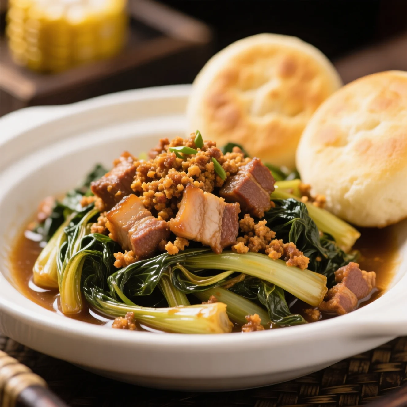 Tendres feuilles de moutarde séchées braisées avec du porc haché juteux et légèrement croustillant. Un plat familial chinois du Nord très aimé, riche en profondeur savoureuse. Servez avec des muffins de maïs cuits à la vapeur pour l'expérience complète.