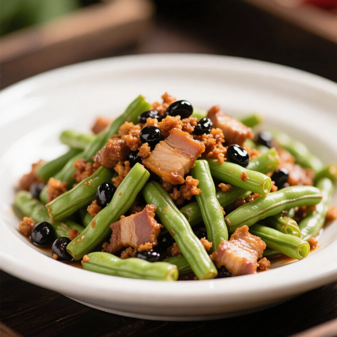 Haricots verts croustillants sautés avec du porc savoureux et des haricots noirs fermentés à la manière classique du Sichuan.