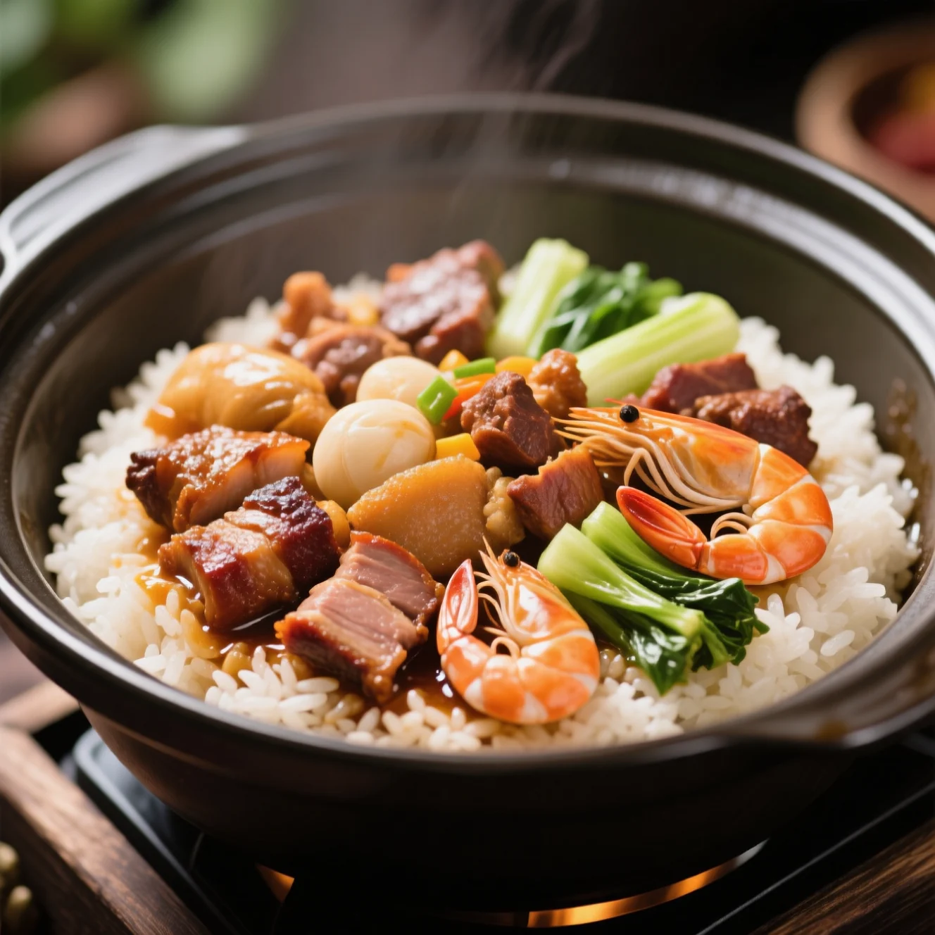 Un bol de riz vapeux copieux et savoureux chargé d'un assortiment de viandes, fruits de mer et légumes frais. Tout cuit ensemble dans une seule marmite pour une saveur riche et authentique.