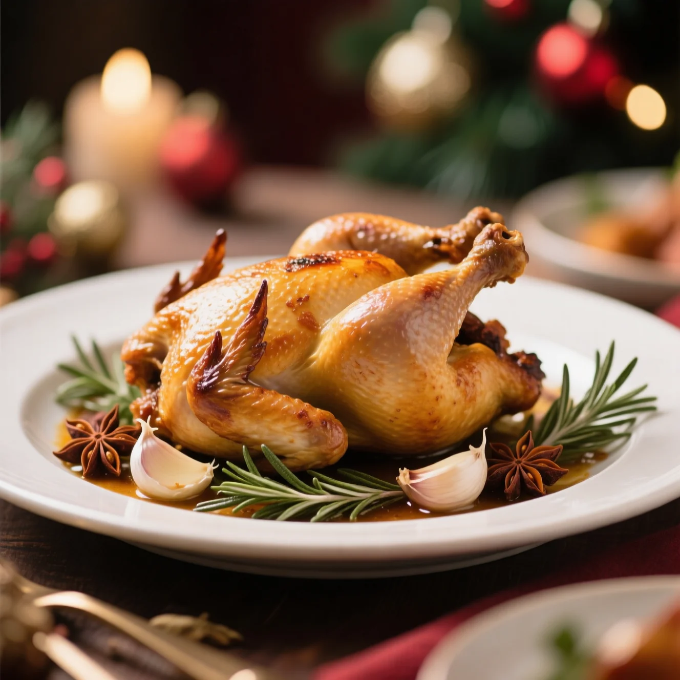 Un petit poulet aromatique rôti avec de l'ail, du romarin et des épices chaudes, parfait pour un dîner de vacances confortable.