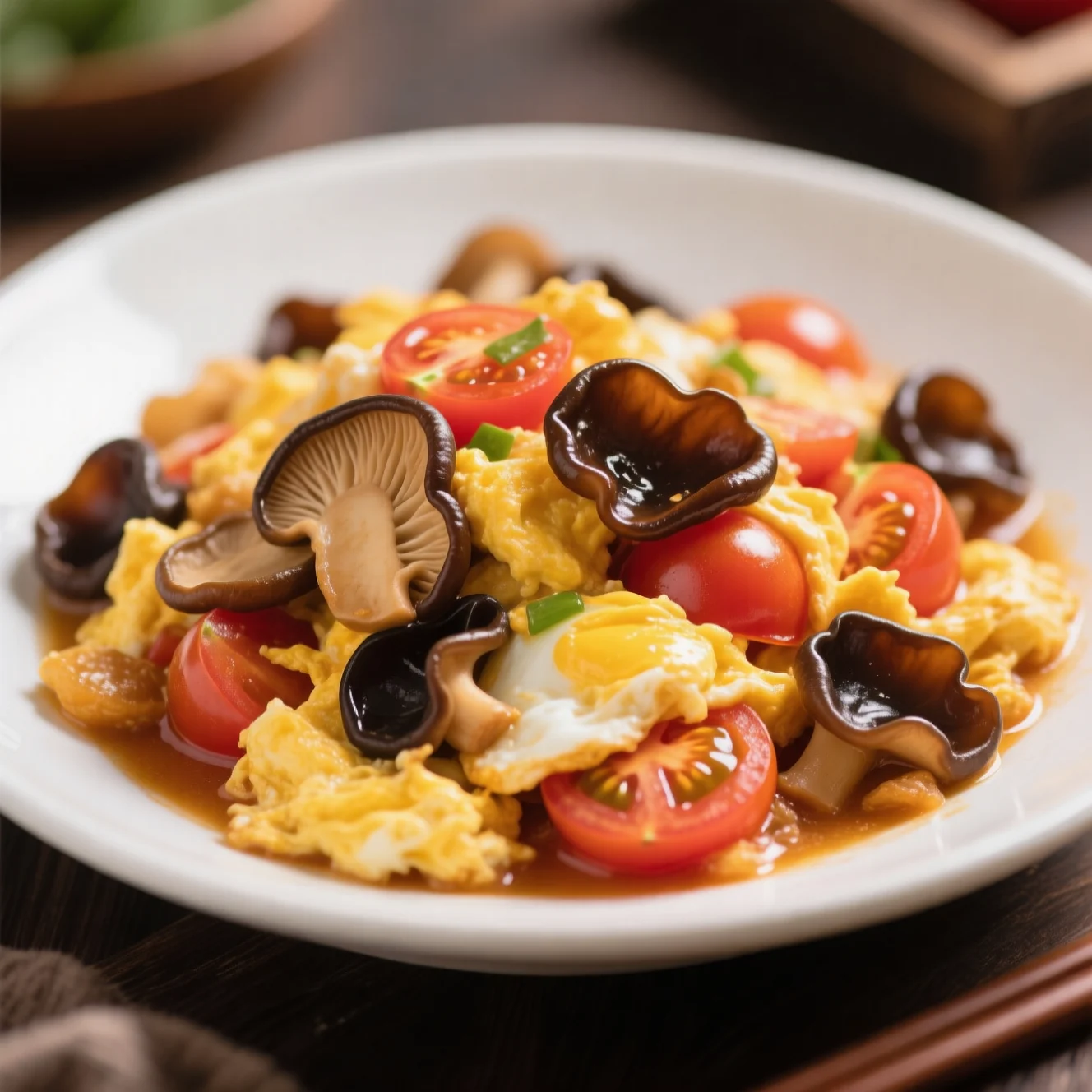 Ce plat est un incontournable des foyers chinois, connu pour son équilibre entre tomates acidulées et œufs tendres. L'ajout de champignons noirs apporte une texture satisfaisante.