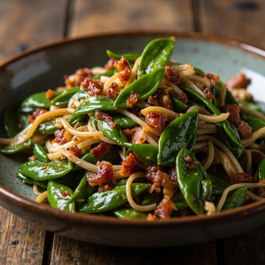 Un sauveur de semaine qui se monte en quelques minutes. Le bacon laisse couler sa graisse dorée tandis que l'ail parfume le wok. Un rapide blanchiment garde les pousses de pois brillantes et croquantes-tendres, puis elles finissent dans la poêle avec une touche de chaleur de piment séché.