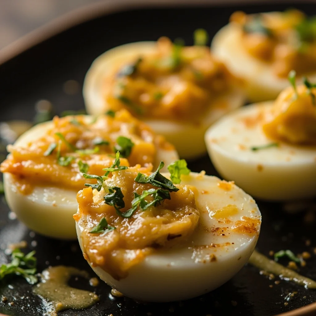Un apéritif élégant où les blancs d'œufs coupés en deux sont farcis d'un mélange crémeux de jaune écrasé, d'ail sauté, d'herbes fraîches et de fromage fondu, puis cuits au four jusqu'à ce qu'ils soient dorés et bulles.