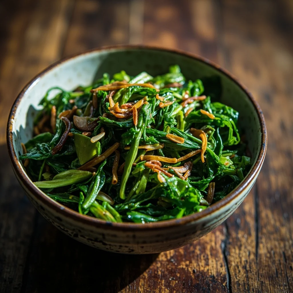 Les feuilles de moutarde, connues sous le nom de jie cai en chinois, ont une saveur poivrée distincte qui s'adoucit magnifiquement lorsqu'elles sont cuites rapidement. La chaleur élevée du wok préserve leur couleur vive et leur texture croquante-tendre tandis que l'ail infuse tout le plat d'une chaleur aromatique.