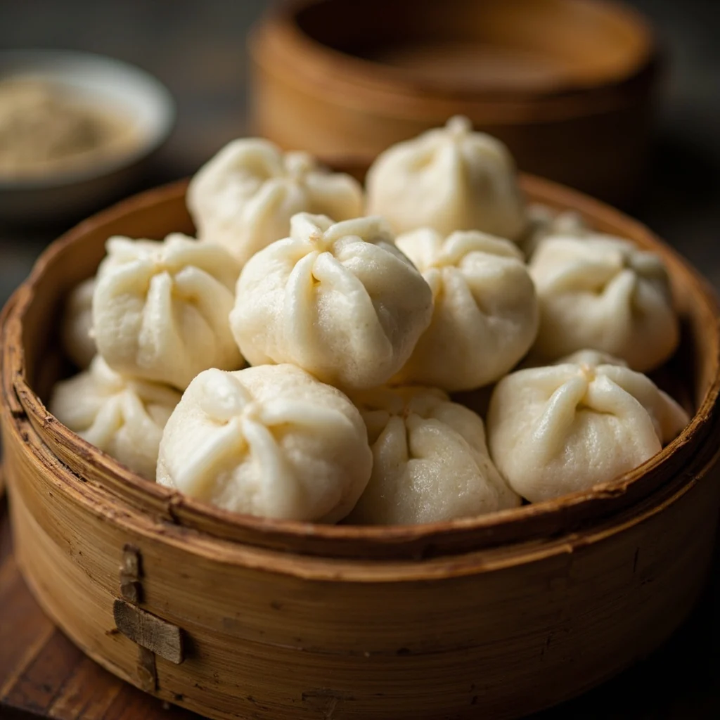 Dégazez la pâte et divisez-la en 6 portions égales. Roulez chaque portion en une boule lisse. Placez-les dans un panier vapeur doublé de papier sulfurisé, en les espaçant. Faites cuire à la vapeur sur l'eau bouillante pendant 15 à 18 minutes. Retirez et laissez refroidir légèrement avant de servir.