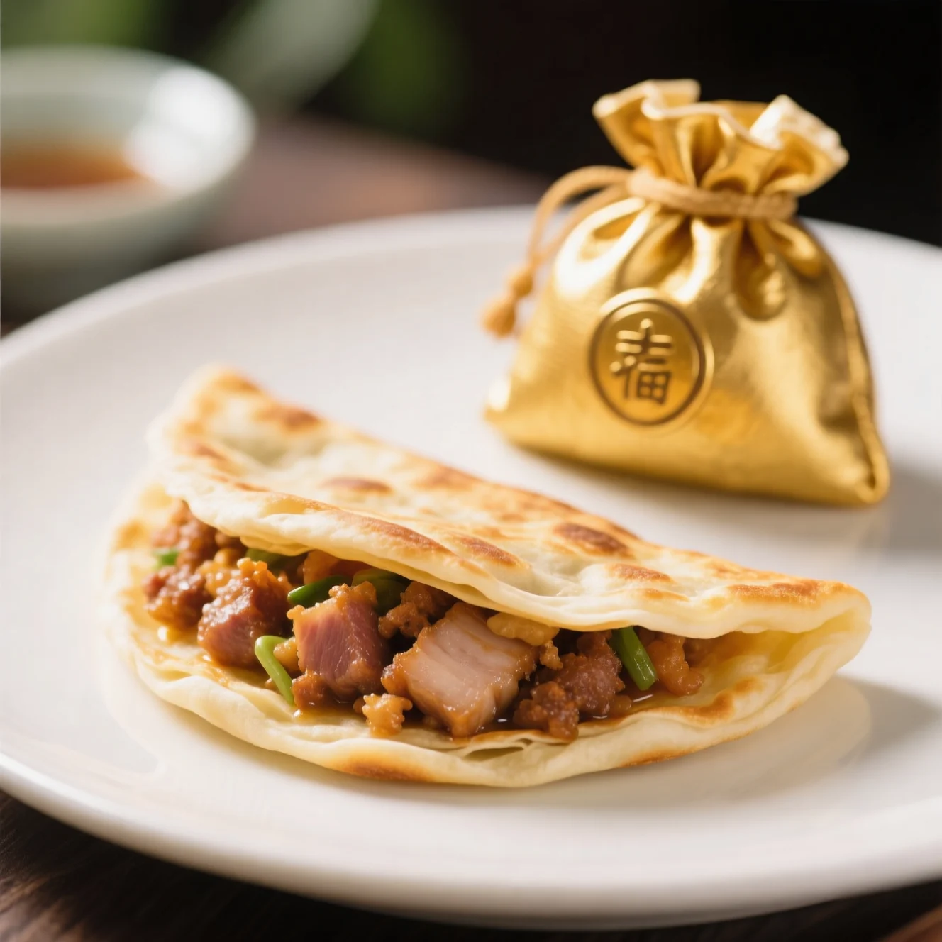 Pain plat croustillant sauté à la poêle farci d'un mélange de porc savoureux, ressemblant aux traditionnels porte-feuilles d'argent.