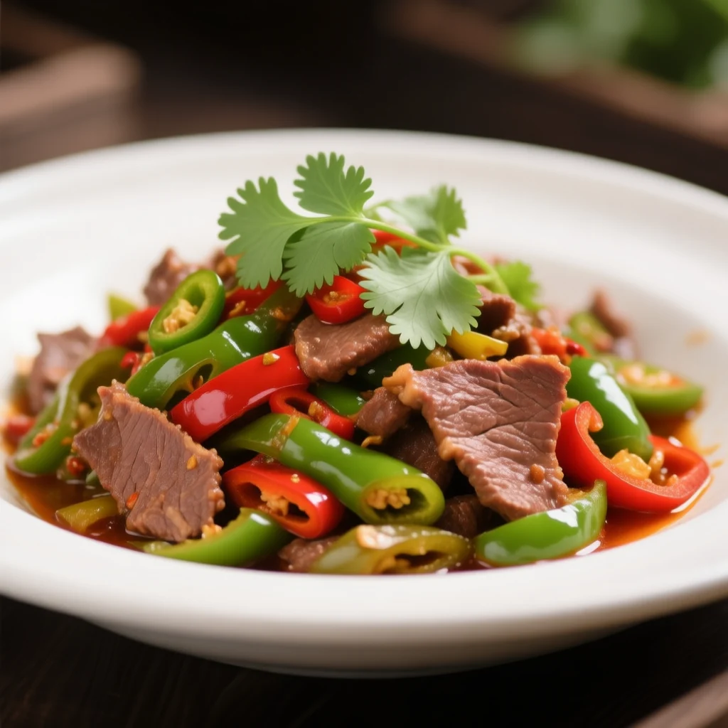 Bœuf Sauté aux Poivrons Marinés Verts et Rouges et Coriandre