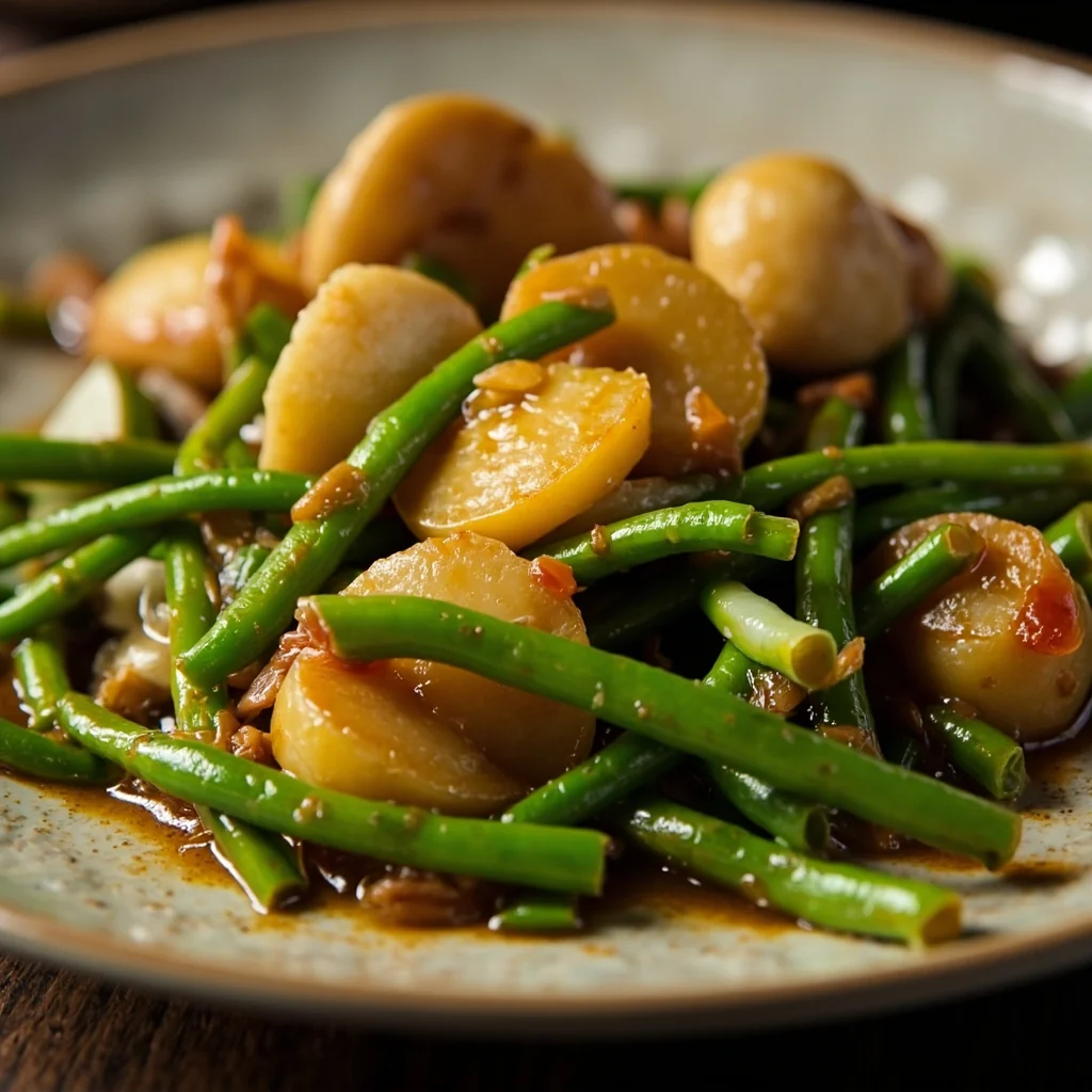 Ajoutez les haricots verts et les pommes de terre dans la marmite. Faites revenir pendant quelques minutes jusqu'à ce que les haricots verts deviennent brillants et que les pommes de terre commencent à dorer légèrement.