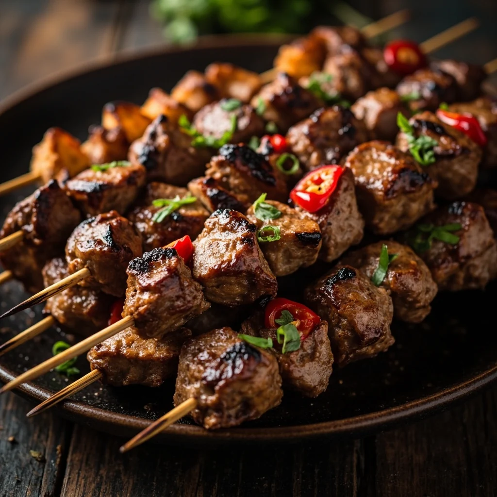 Enfilez 4-5 morceaux d'agneau sur chaque brochette en bois de bamboo, en laissant un petit espace entre les morceaux pour une cuisson uniforme.