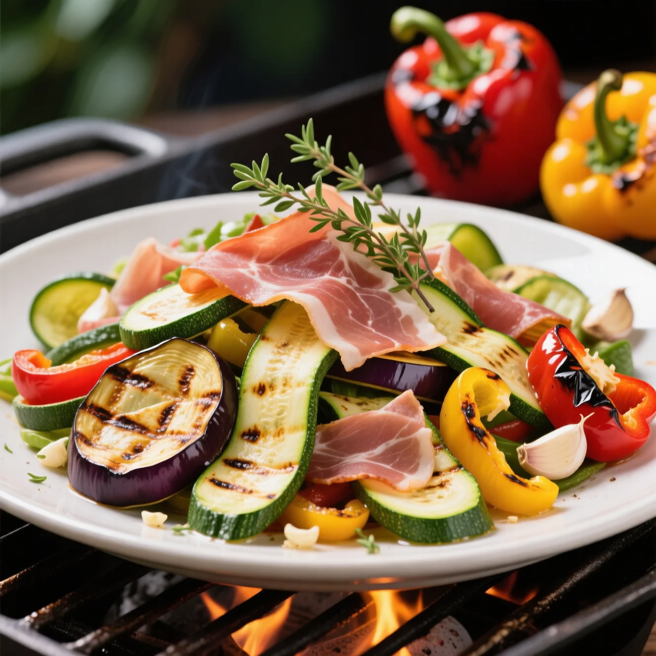 Salade de légumes méditerranéens grillés avec jambon de Parme