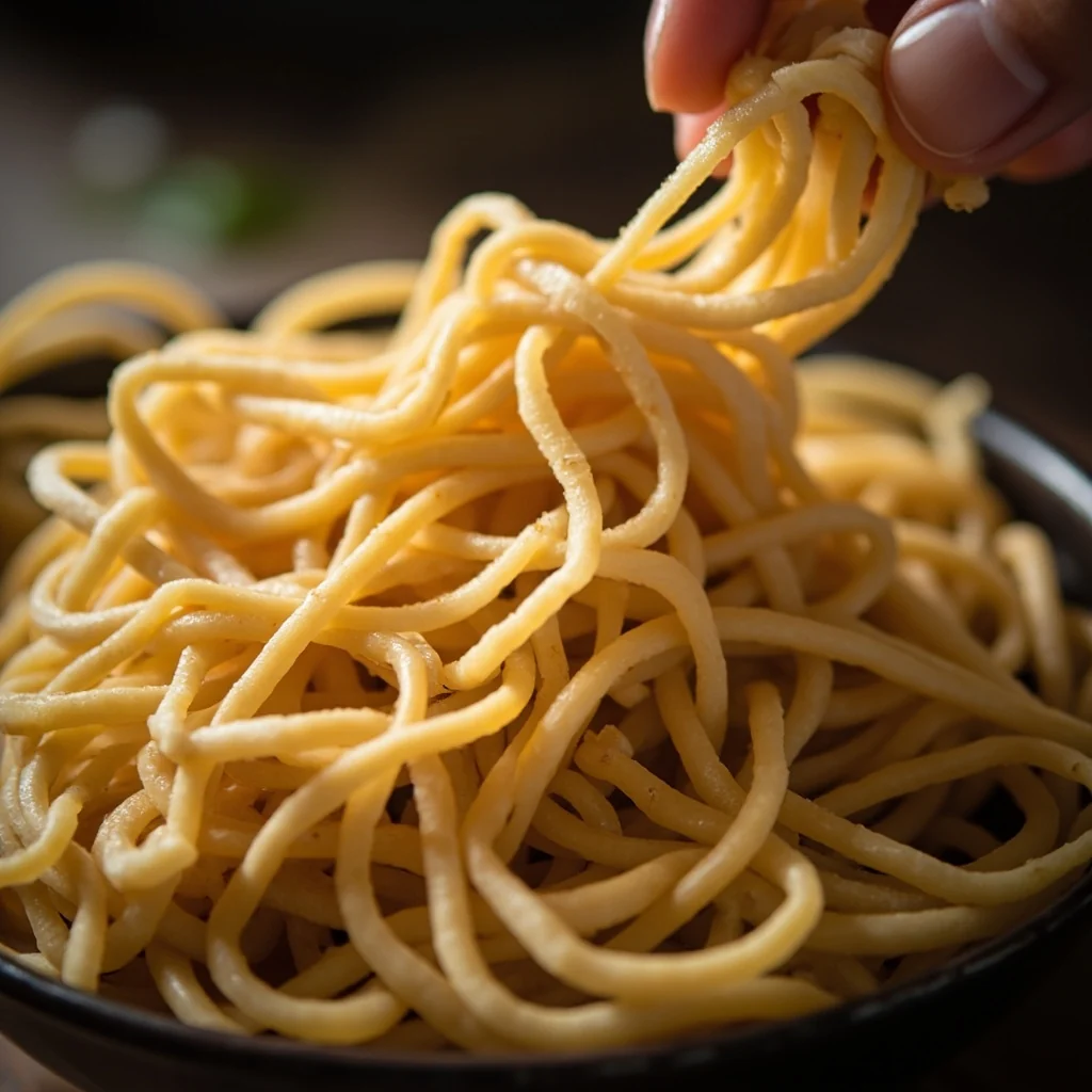 Nouilles rondes fraîches de style chinois préparées à partir de zéro à l'aide d'une machine à pâtes. Ces nouilles moelleuses et élastiques sont parfaites pour les soupes ou les sautés et peuvent être séchées pour une utilisation ultérieure.