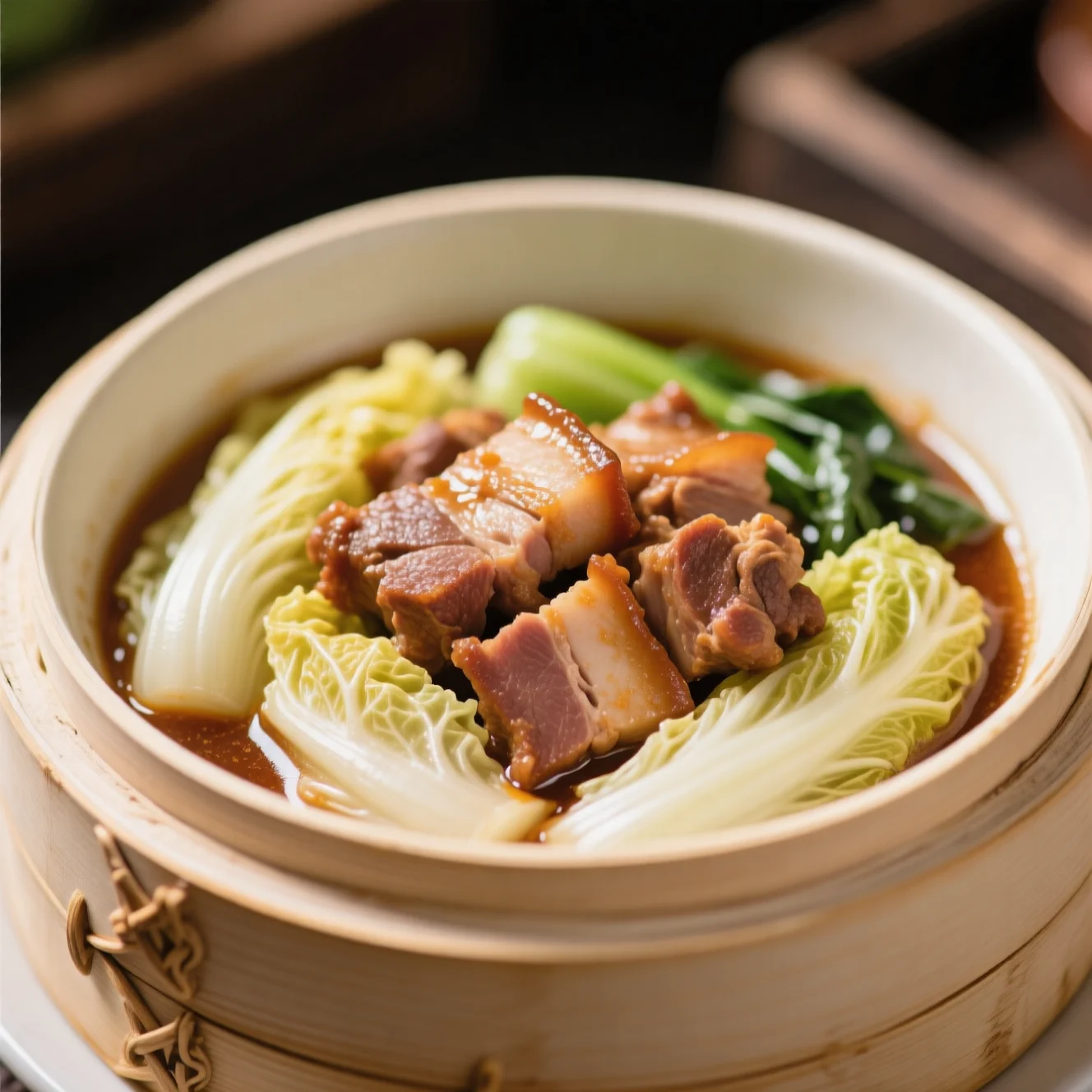 Une spécialité traditionnelle du Henan avec du porc assaisonné cuit à la vapeur à l'intérieur de tendres feuilles de chou, puis terminé avec une sauce onctueuse savoureuse. Ce plat réconfortant réunit viande tendre et légumes frais dans un seul contenant de cuisson à la vapeur.