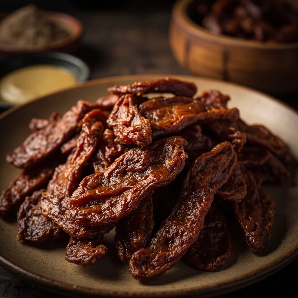 Préchauffez le four à 120°C (250°F). Tapissez une plaque de cuisson de papier parchemin. Retirez le bœuf de la marinade en secouant l'excédent. Disposez les tranches en une seule couche sans les superposer. Faites cuire pendant 2 à 2,5 heures en les retournant à mi-parcours, jusqu'à ce qu'elles soient séchées mais encore légèrement souples.