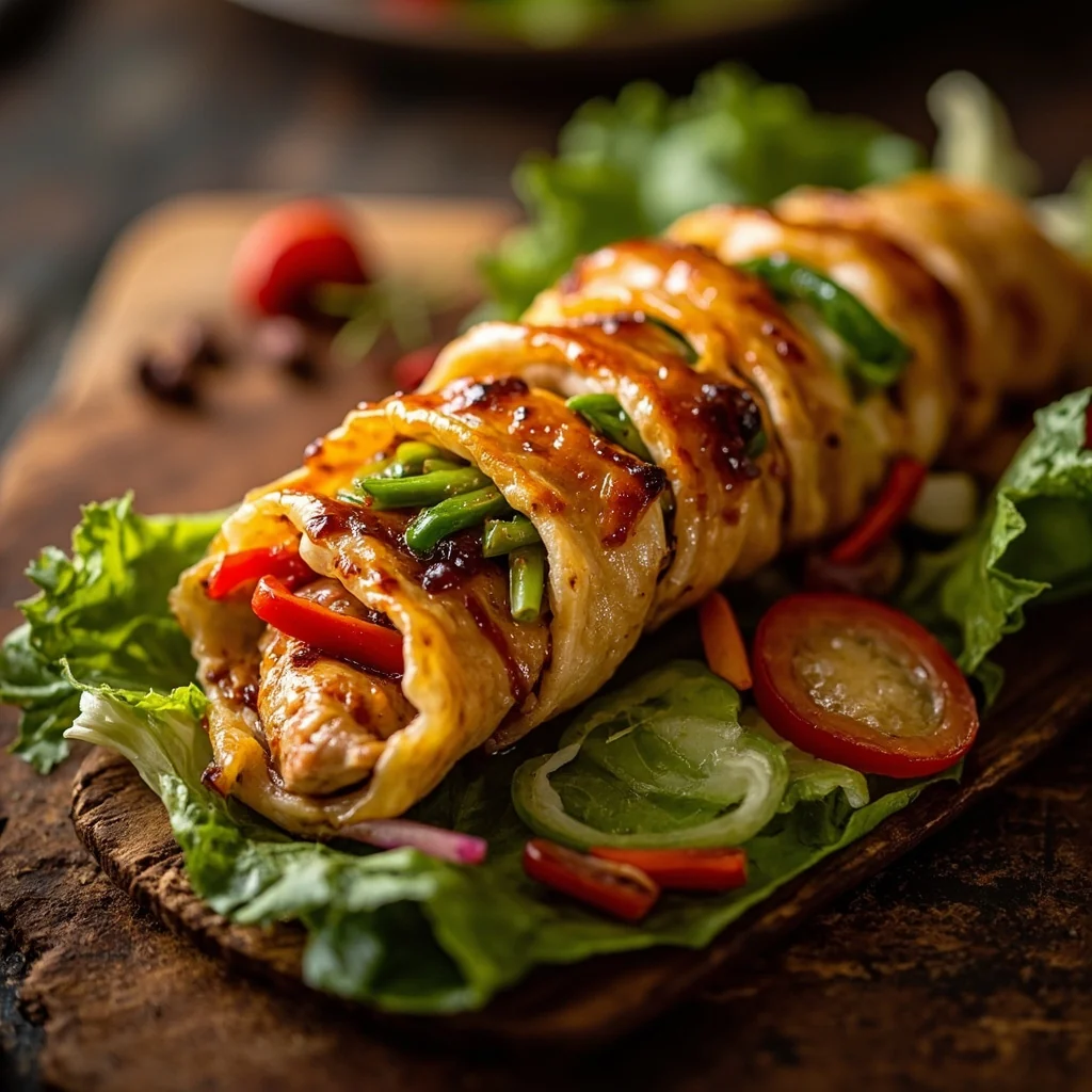 Préchauffez le four à 200°C (400°F). Étalez un haut de cuisse de poulet mariné à plat, disposez 2-3 asperges et quelques bâtons de carrots le long d'un bord. Roulez fermement la viande autour des légumes, en fixant avec de la ficelle de cuisine ou des cure-dents.
