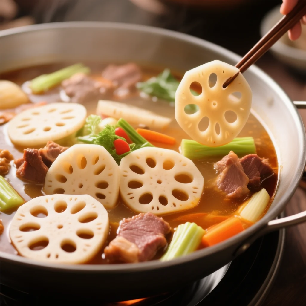 Ajoutez les tranches de lotus dans le bouillon frémissant. Faites cuire pendant 5 à 7 minutes jusqu'à ce qu'ils deviennent tendres mais conservent encore un léger croquant. L'amidon contenu dans le lotus épaissira légèrement le bouillon.