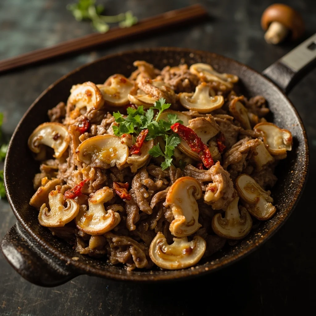 Un sauté rapide et savoureux mettant en vedette des tranches de porc tendres accompagnées de champignons pleurotes à la texture charnue, relevés par de l'ail aromatique et une touche de piquant des piments séchés.