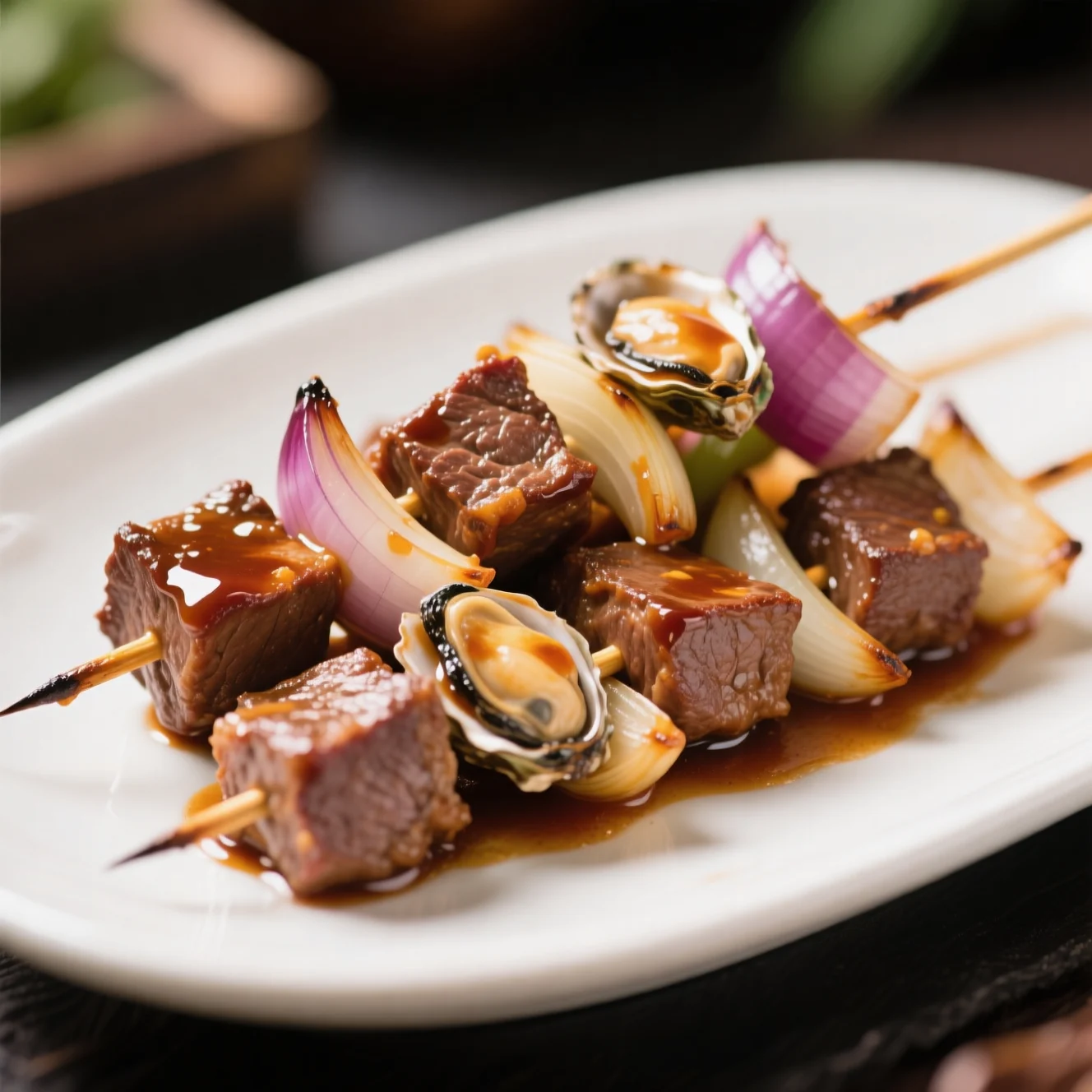 Brochettes de bœuf et oignon à la sauce aux huîtres