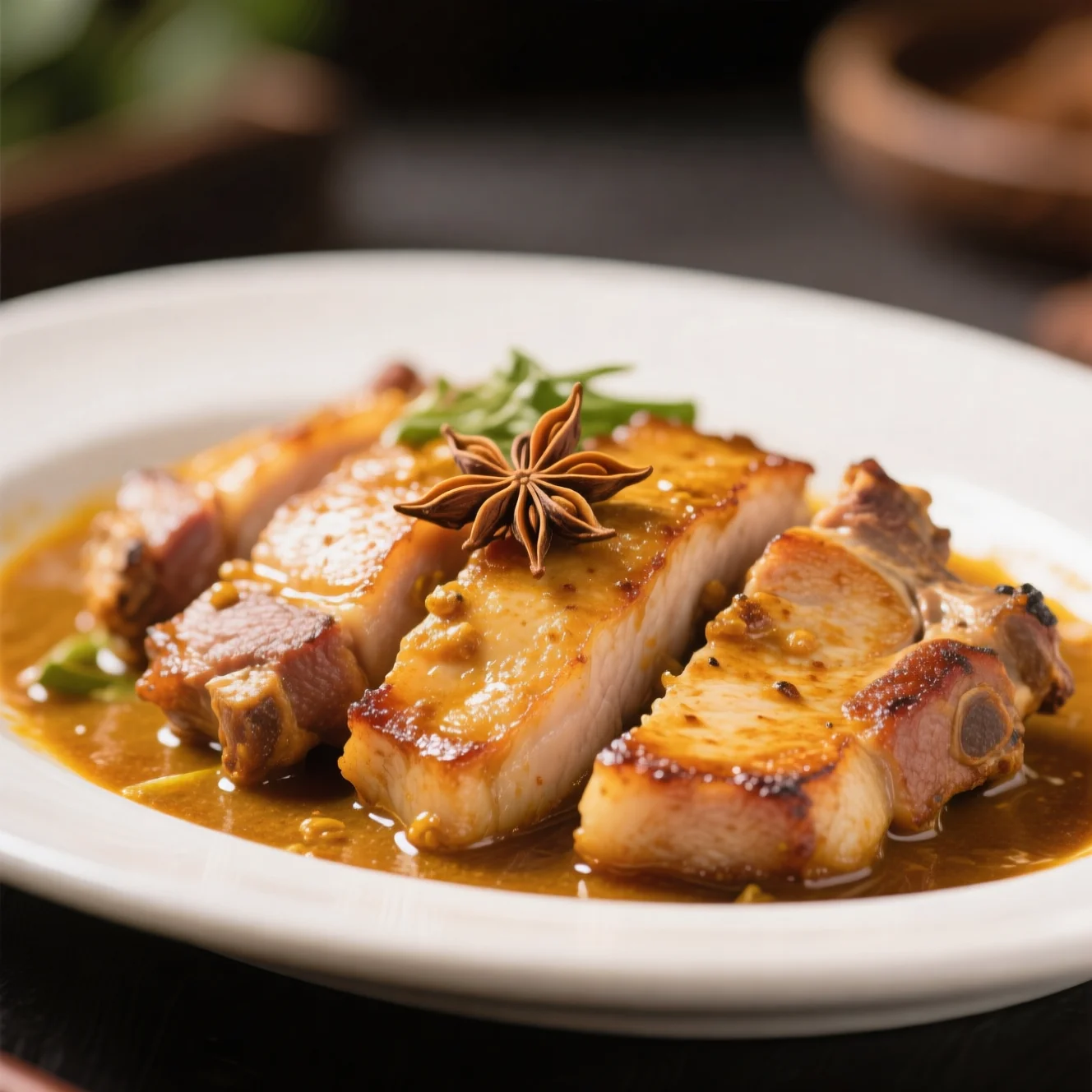 Tendres côtelettes de porc marinées dans un mélange savoureux de curry et de sauce soja, puis poêlées à la perfection dorée avec une touche de cumin.