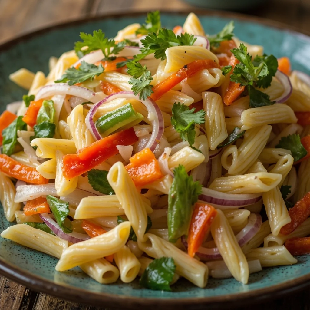 Une salade de pâtes légère et rafraîchissante, parfaite pour les déjeuners d'été ou en accompagnement. Les pâtes tendres se marient bien avec les croquants légumes étabhis dans une sauce crémeuse.
