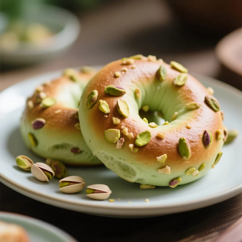Des bagels tendres et moelleux parsemés de pistaches croquantes. Ces bagels faits maison ont une belle teinte verte grâce aux noix et constituent un délicieux petit-déjeuner.