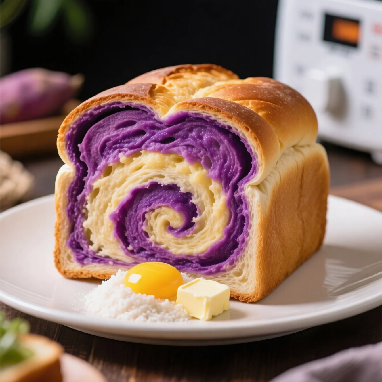 Pour un effet marbré, ajoutez la purée de patate douce violette en une couche séparée sur la farine, ou réservez 3 cuillères à soupe pour les incorporer après le premier cycle de pétrissage si votre machine le permet.