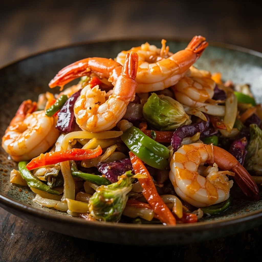 Un plat vibrant avec des crevettes tendres et des légumes colorés incluant l'igname violette, les choux de Bruxelles, le céleri et le poivron. Les légumes sont blanchis brièvement pour préserver leur texture croquante et leurs couleurs brillantes, puis mélangés avec des crevettes juteuses pour une présentation thérapeut