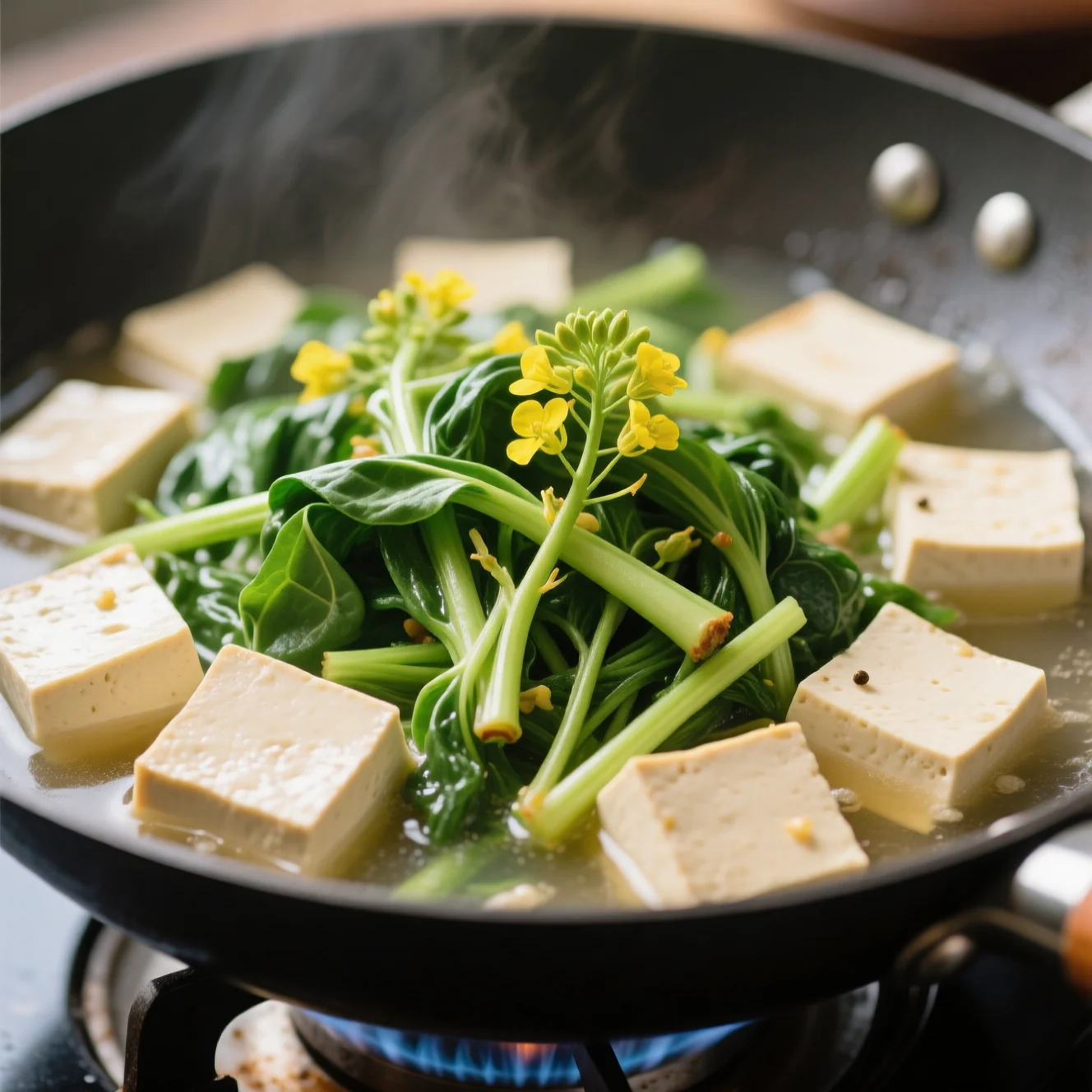 Sortir délicatement le tofu soyeux de son emballage et le couper en cubes de taille normale. Couper les parties dures des feuilles de colza et couper les tiges en morceaux de 5 cm. Conserver les feuilles et les tiges ensemble.
