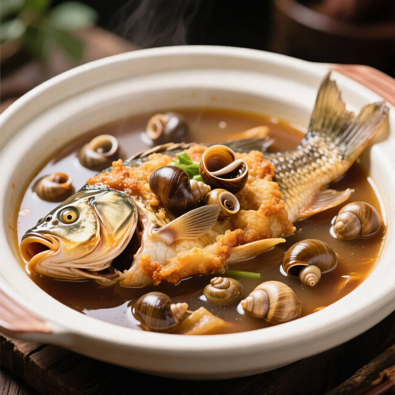 Ce plat célèbre les richesses de la rivière, combinant un poisson tendre avec des escargots terreux. La clé est de bien purger les escargots et de faire frire le poisson jusqu'à ce qu'il soit doré et croustillant avant de le mijoter pour créer une base riche et savoureuse.