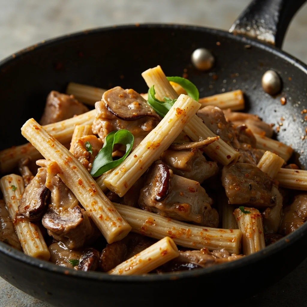 Un sauté rapide comprenant du porc tendre, des champignons matsutake soyeux et des bâtonnets de tofu fermenté moelleux. Les matsutake ont un арôme incroyable, presque pins, qui s'harmonise magnifiquement avec les notes subtiles salées des bâtonnets de tofu fermenté. Ce plat se prépare en moins de 30 minutes une fois les ingrédients trempés et préparés.