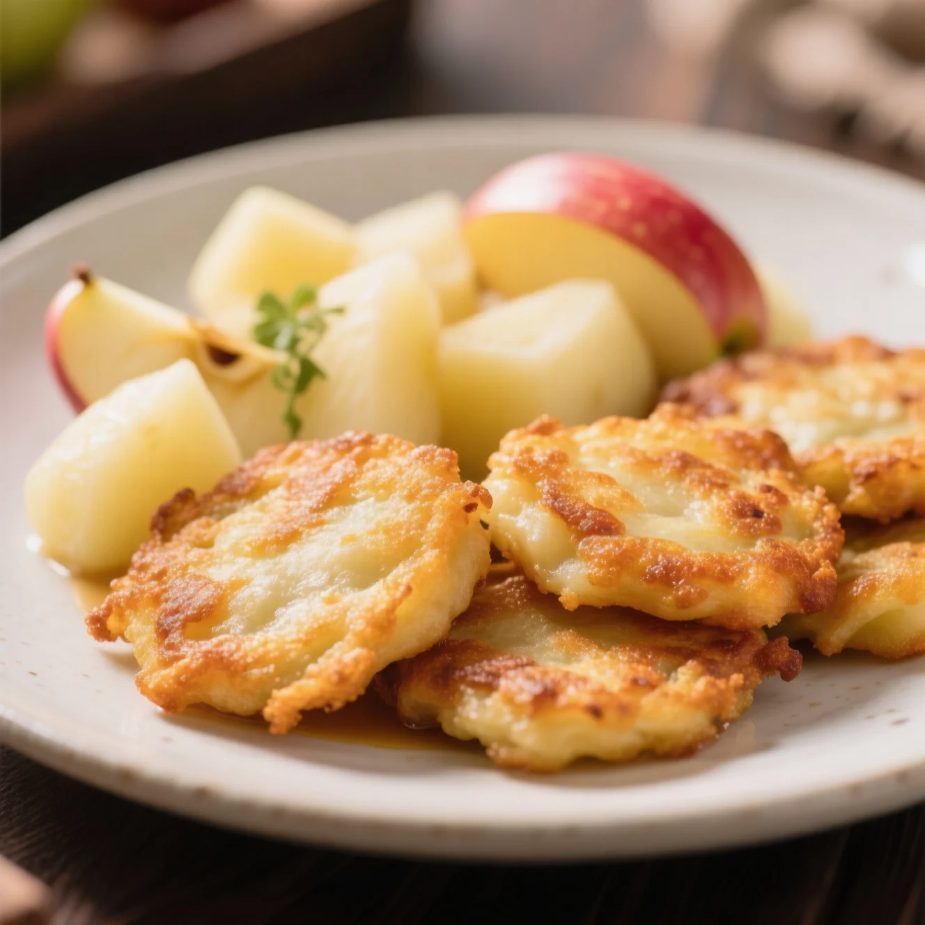Des galettes dorées et croustillantes poêlées, faites à partir de pommes de terre vapeur et de pommes fraîches. Un équilibre délicieux entre sucré et salé, parfait pour le petit-déjeuner ou une collation légère.