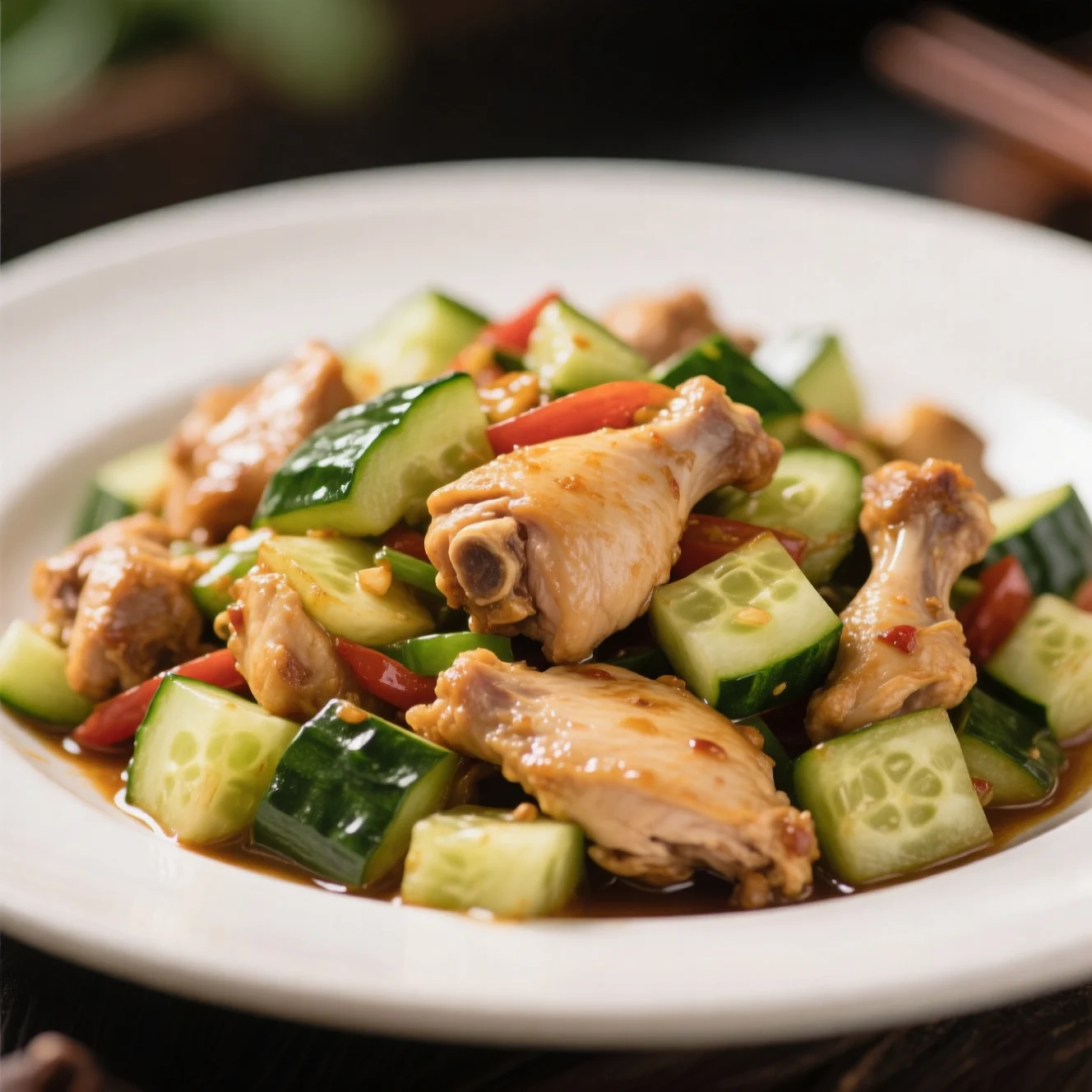 Un sauté rapide et savoureux composé de morceaux tendres de cuisses de poulet marinées et de cubes de concombre croustillants.