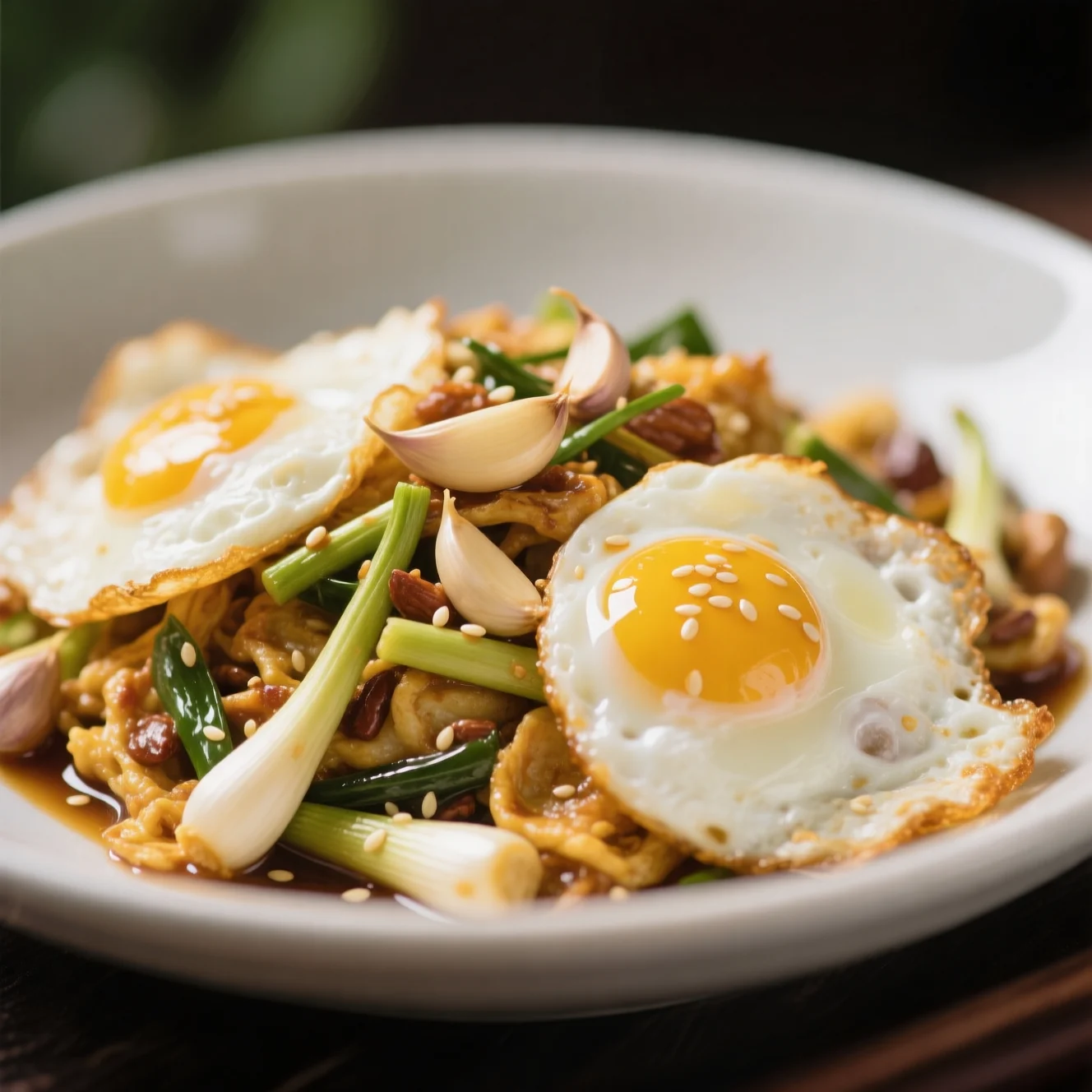 Ce plat célèbre la douceur piquante des pousses d'ail (également connues sous le nom de tiges d'ail ou d'ail vert). En faisant frire les œufs séparément en premier, ils conservent une texture moelleuse qui se marie parfaitement avec les légumes tendres et croustillants.