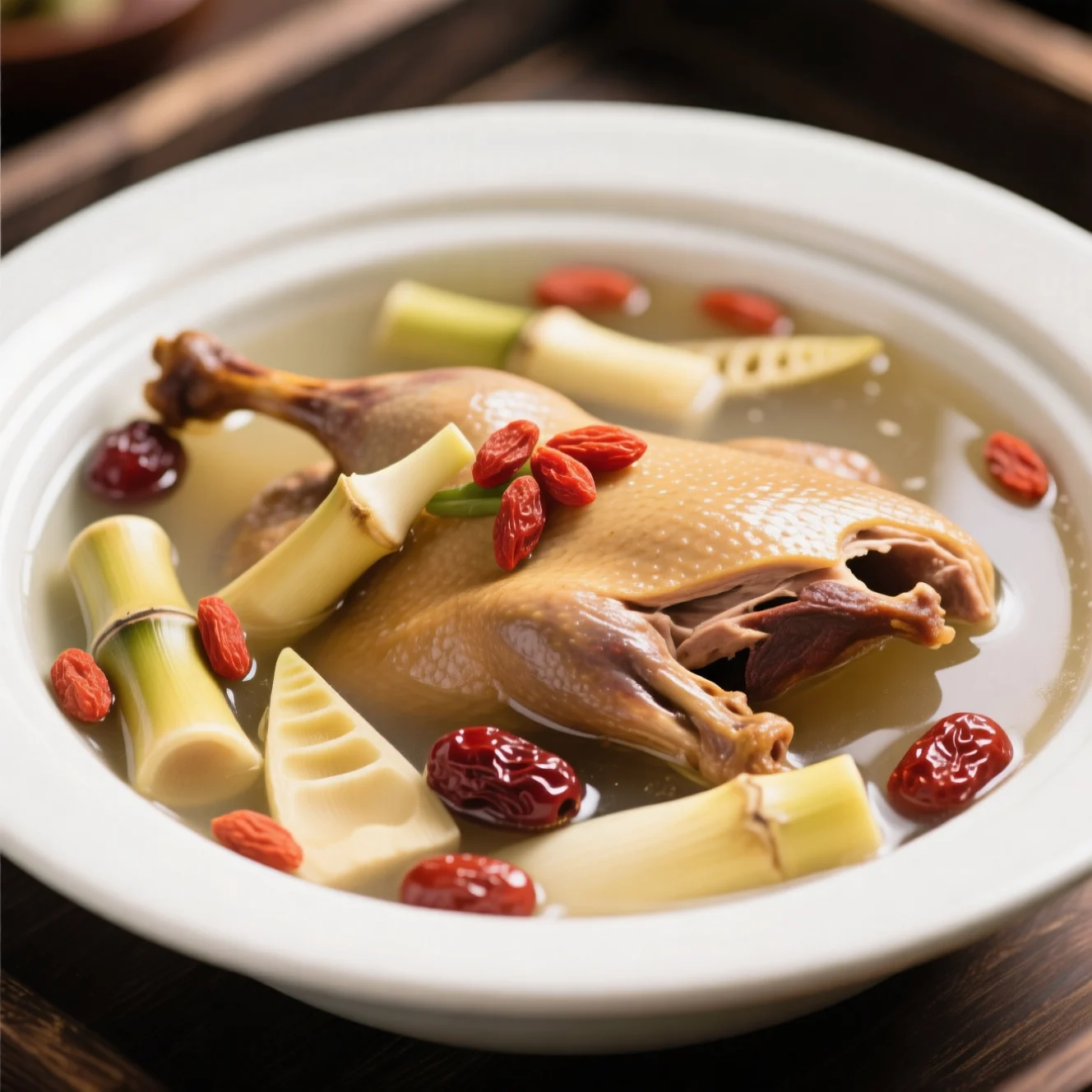 Une soupe claire et nourrissante mettant en vedette du canard âgé tendre, des pousses de bambou croustillantes et des baies de goji sucrées, mijotées lentement pour une saveur profonde.