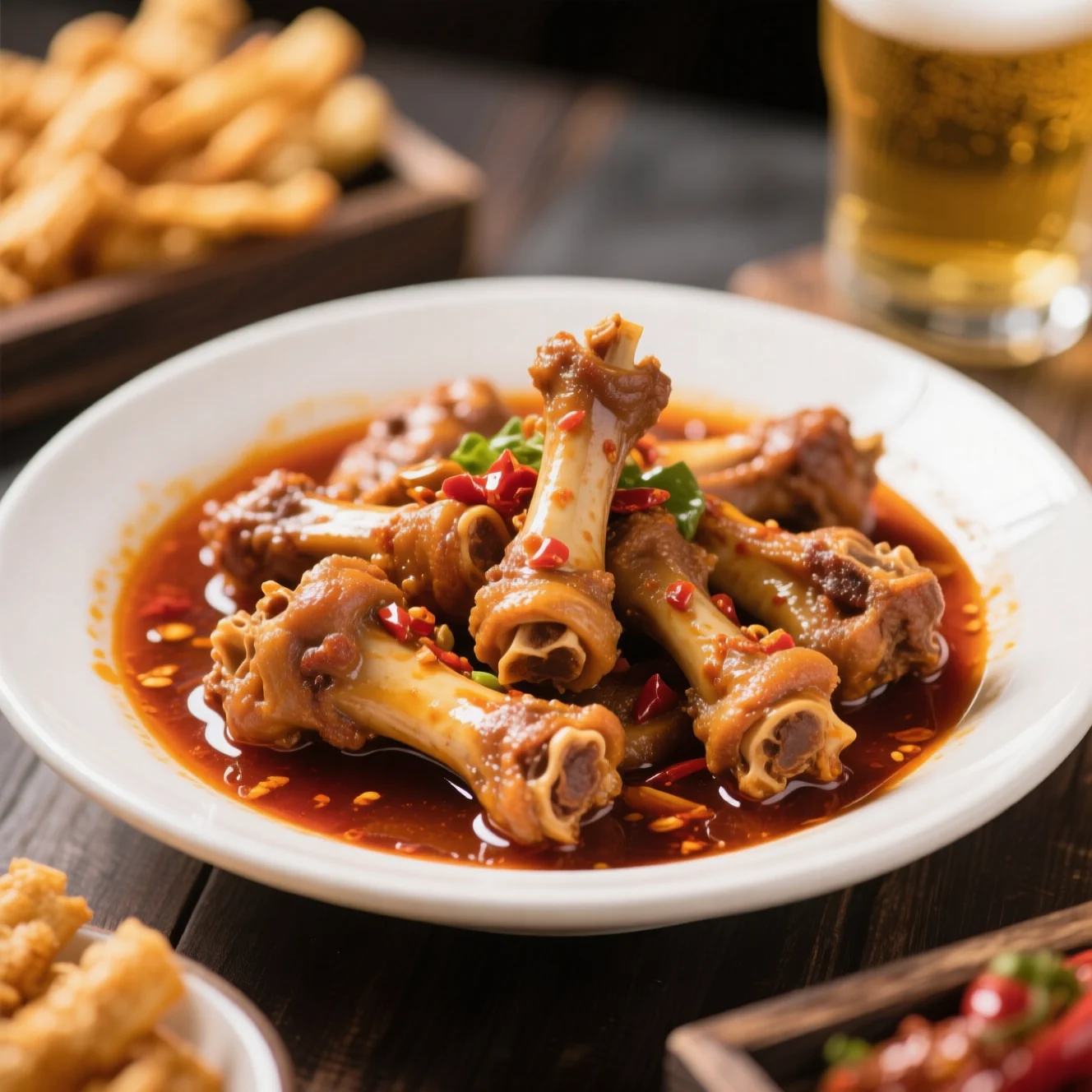 Ajoutez les cous de poulet blanchis dans le wok et remuez pour enrober uniformément dans l'huile épicée. Versez la bière et la sauce soja, puis ajoutez les flocons d'aubépine et les baies de goji. Portez à ébullition douce.
